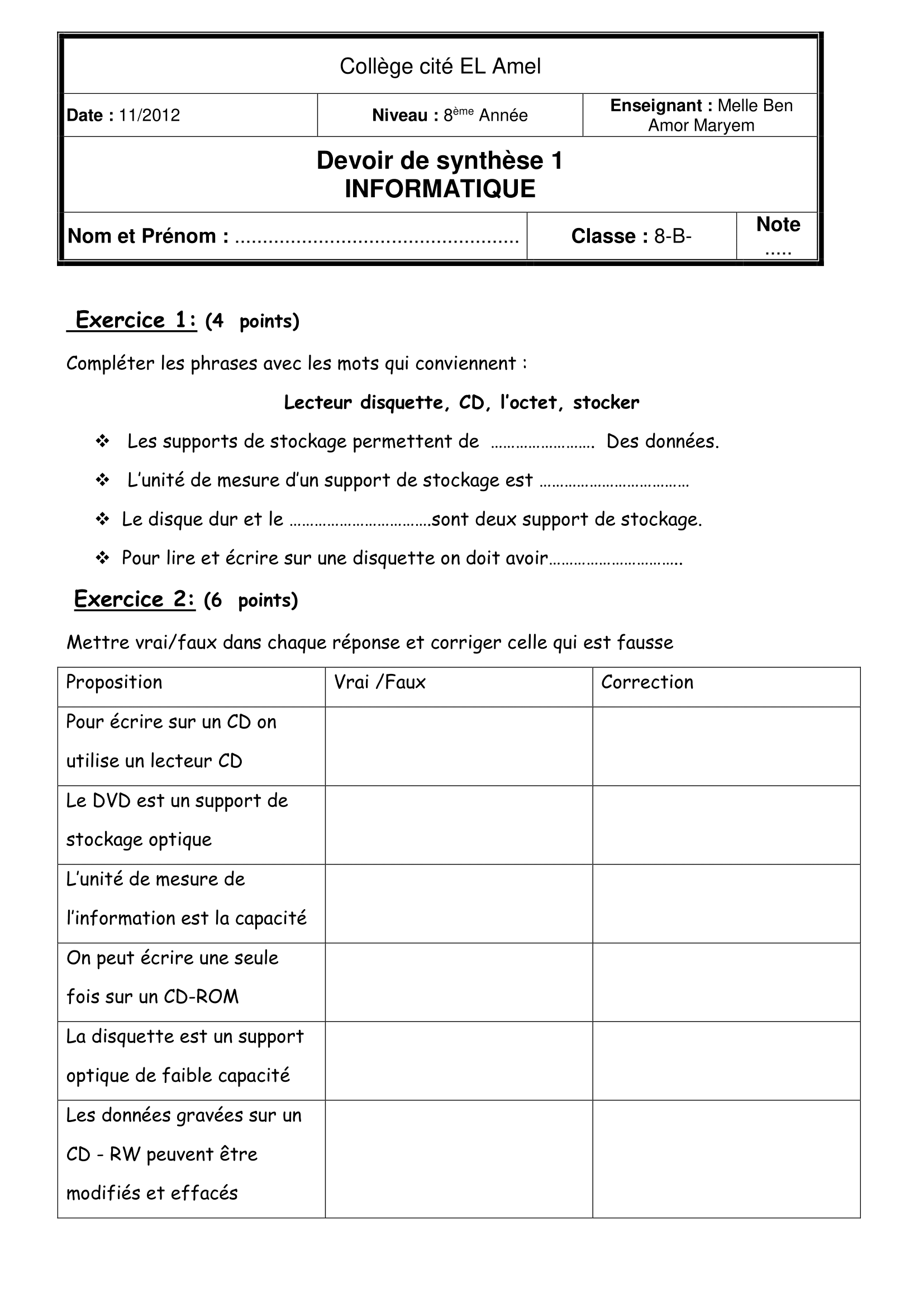 Devoir de Synthèse n°1 Informatique 8ème année / Exemplaire n°2